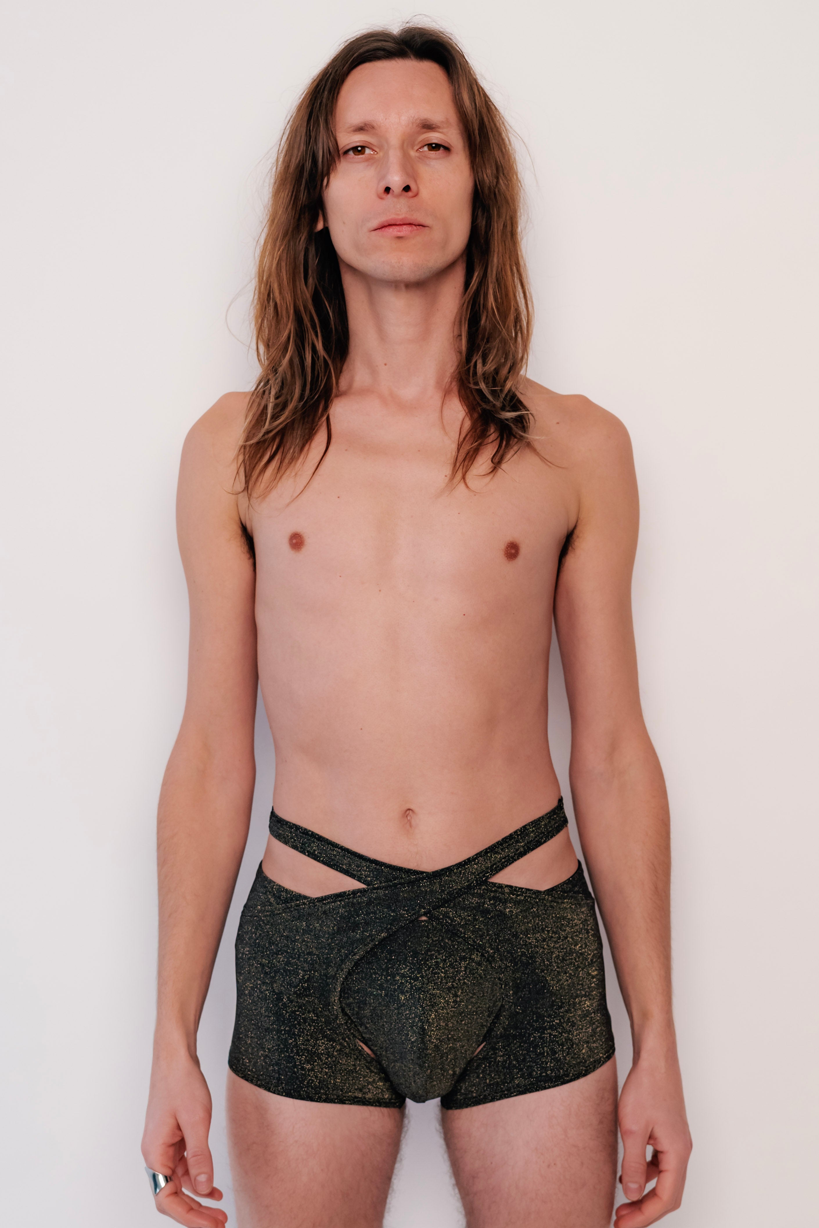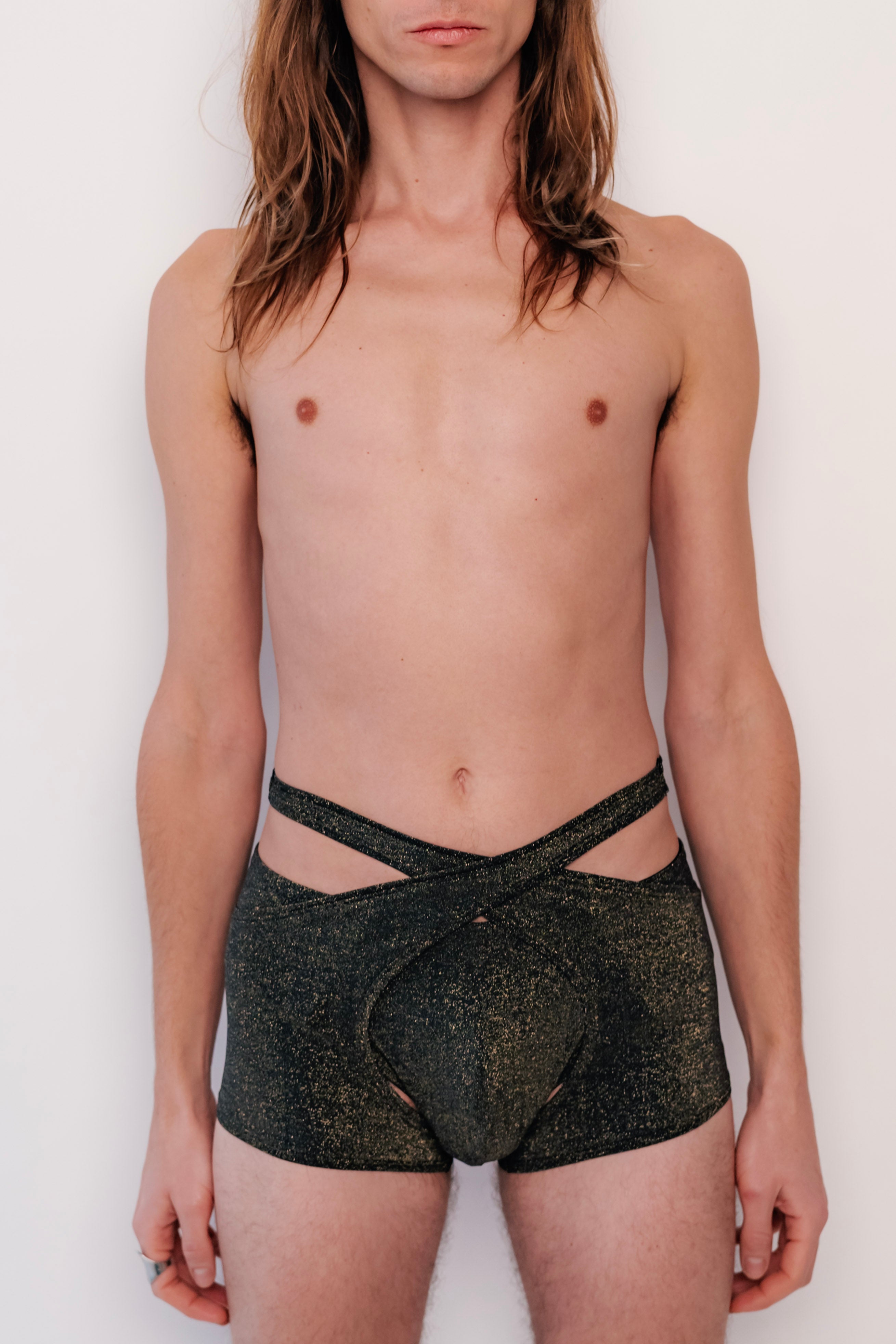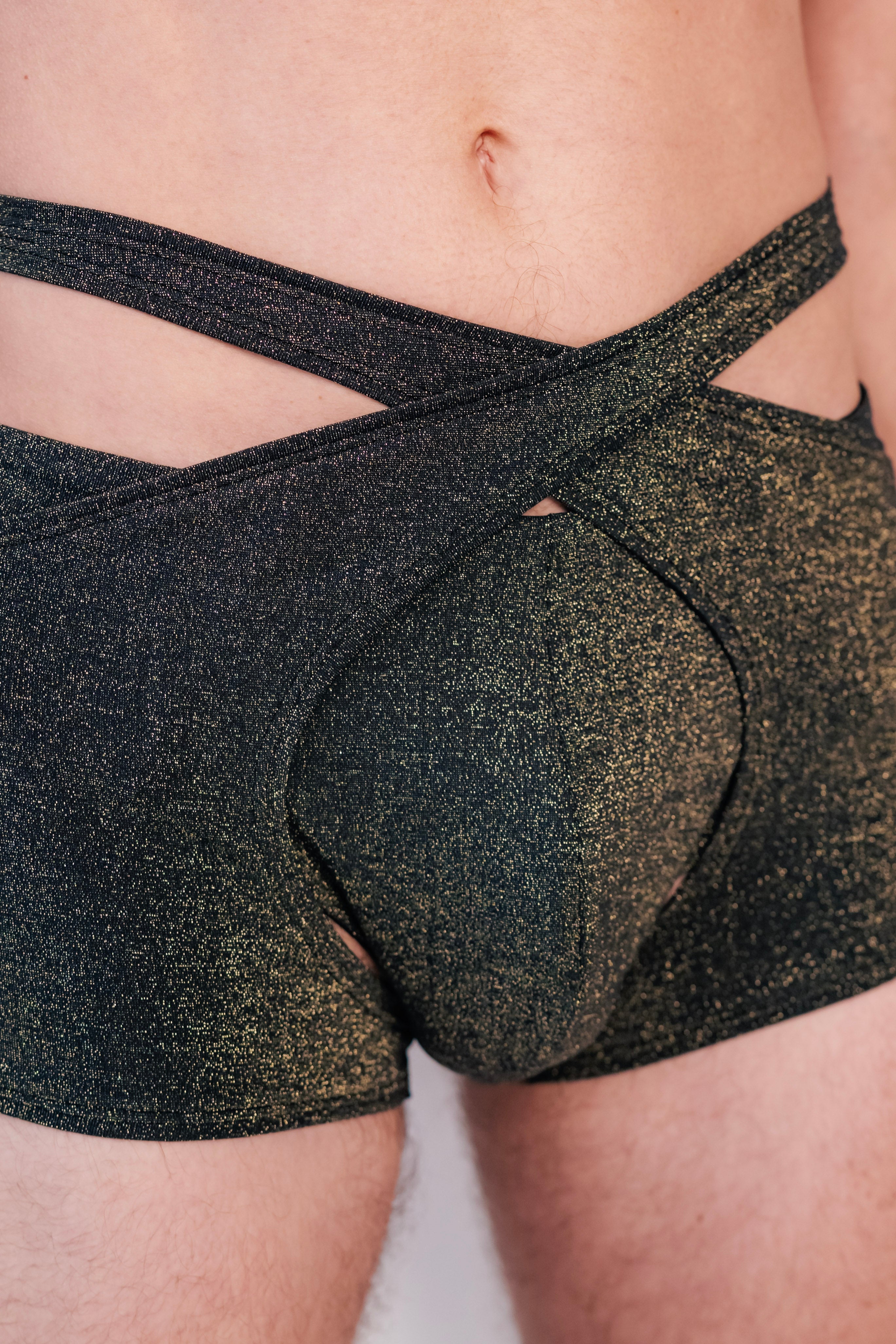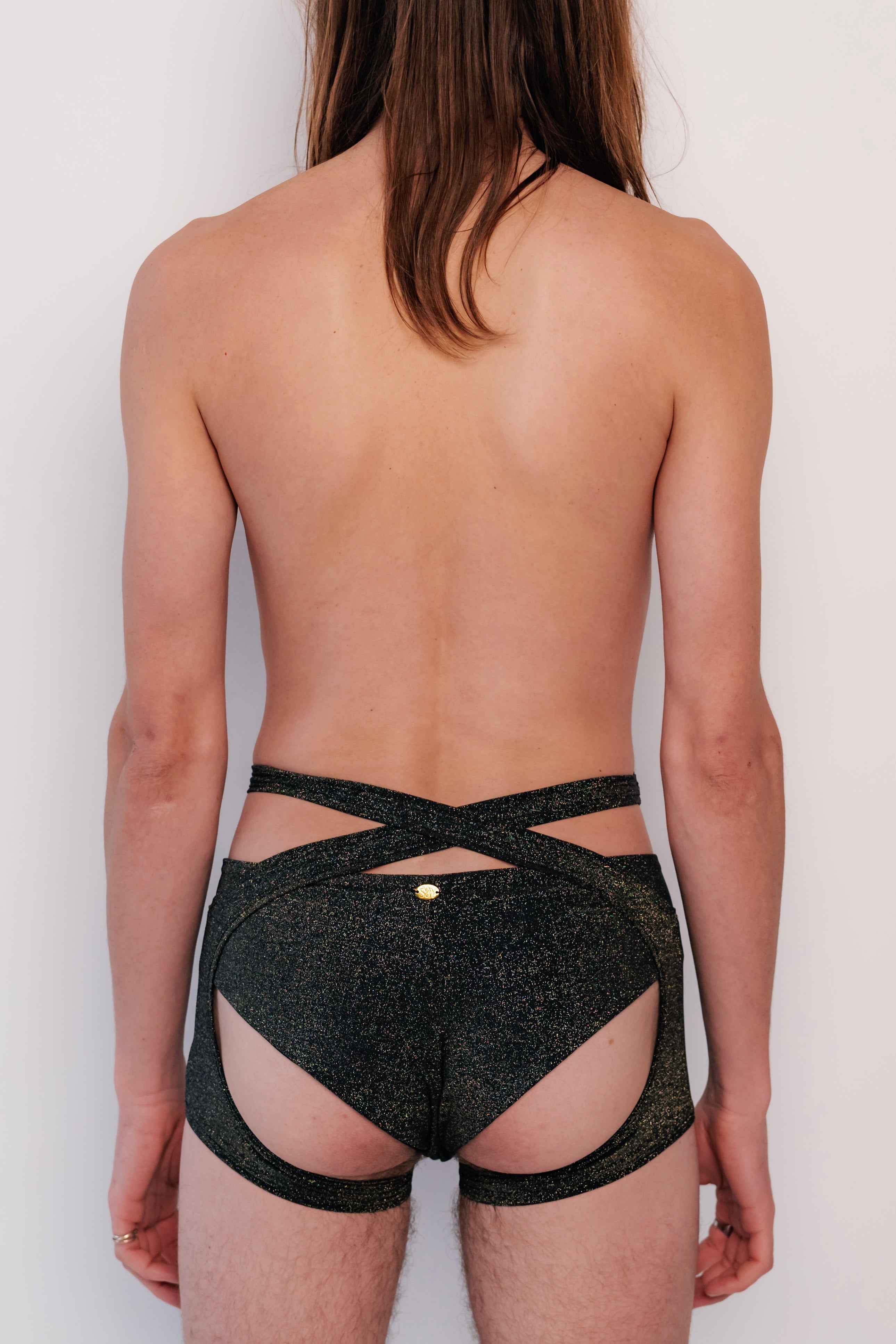 Black sparkle with gold threads meets harness sophistication. The Freddie Short Chaps deliver elastic straps that frame your body with crisscross elegance. Layer over anything you already own.