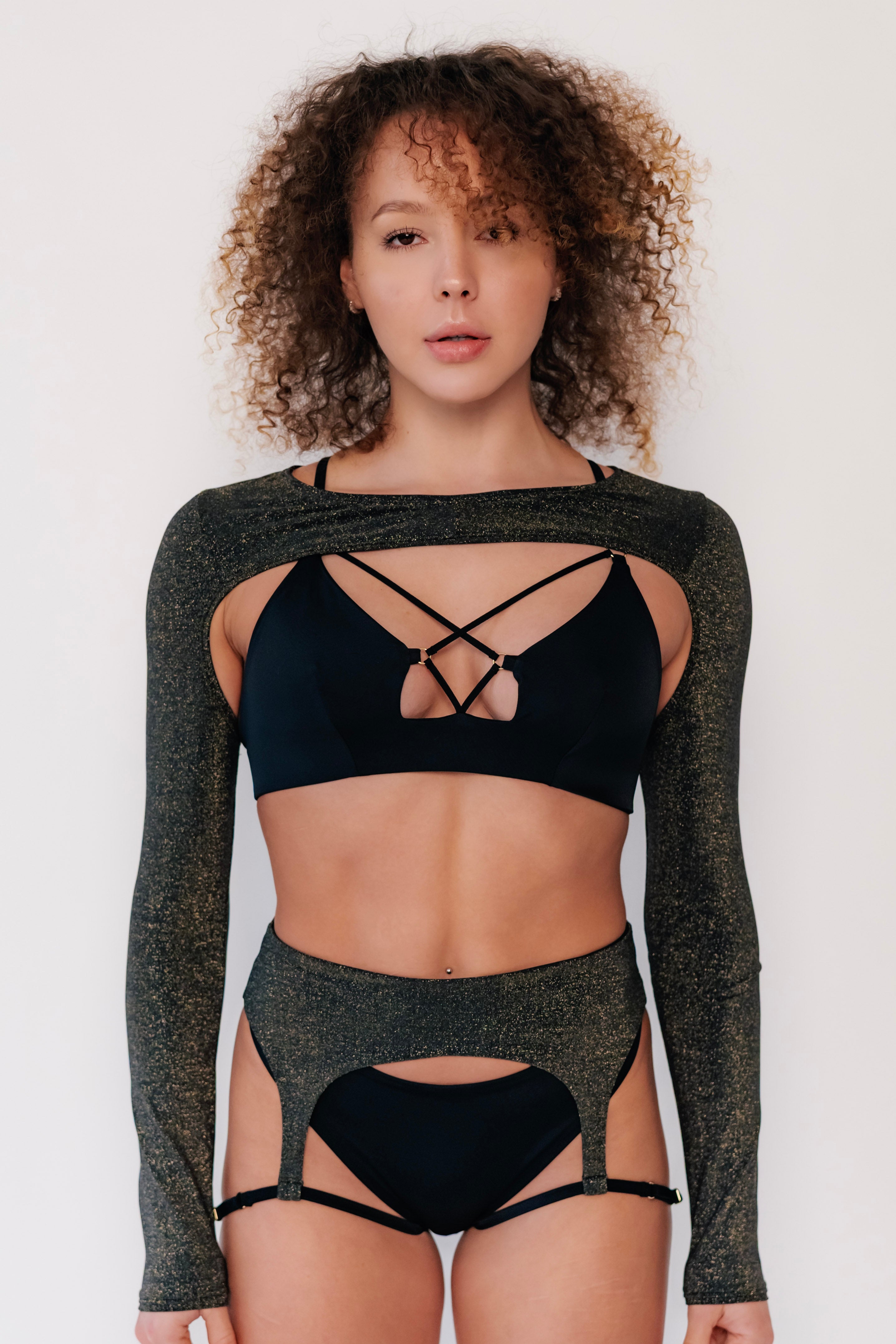 Black sparkle with gold threads meets intelligent pole design. The Lauren Longsleeve Shrug delivers arm coverage without compromising torso grip. Strategic armpit cutouts and open torso preserve pole contact while longsleeves provide sophisticated warmth.