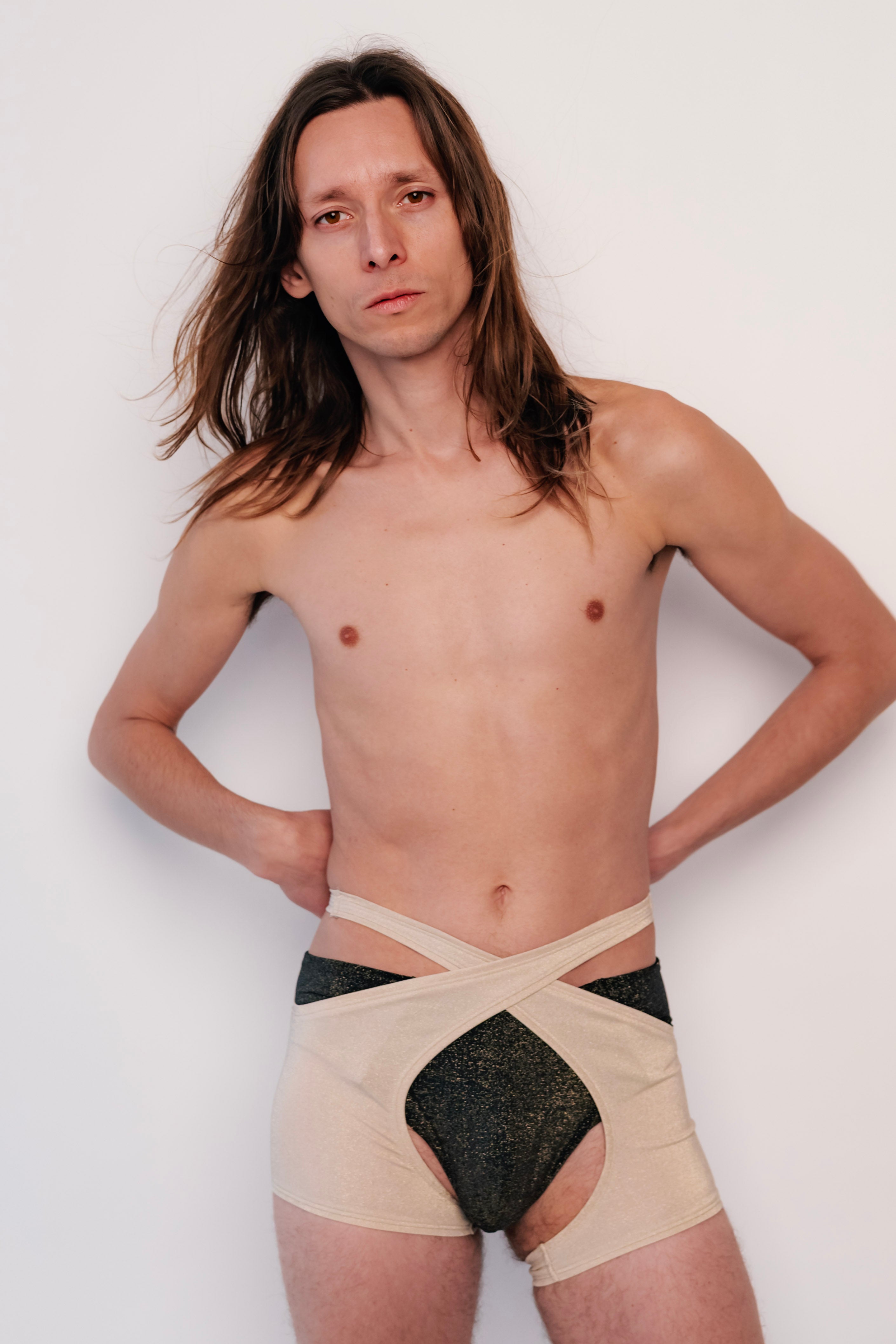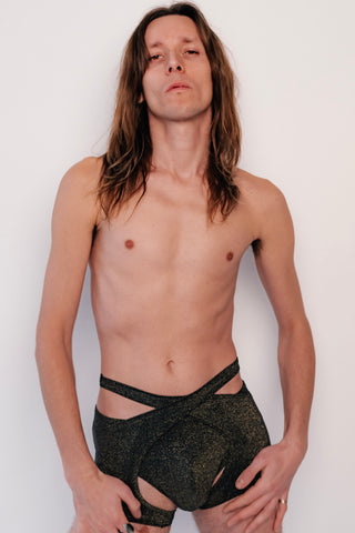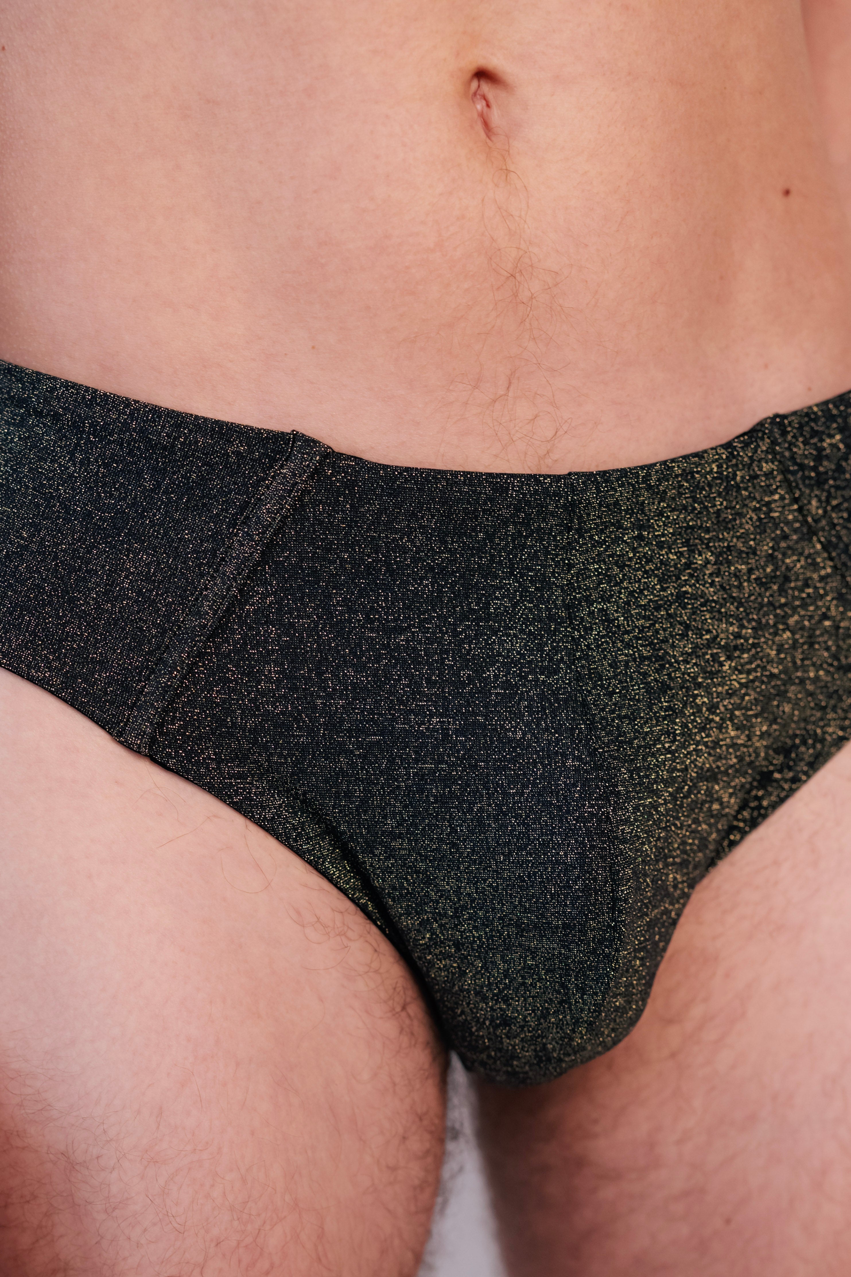 Black lurex base with gold metallic threads creates subtle elegance. The contoured design sculpts without restricting. Spacious pouch with soft viscose lining delivers all-day comfort. 4-way stretch moves with your body. This is understated power.