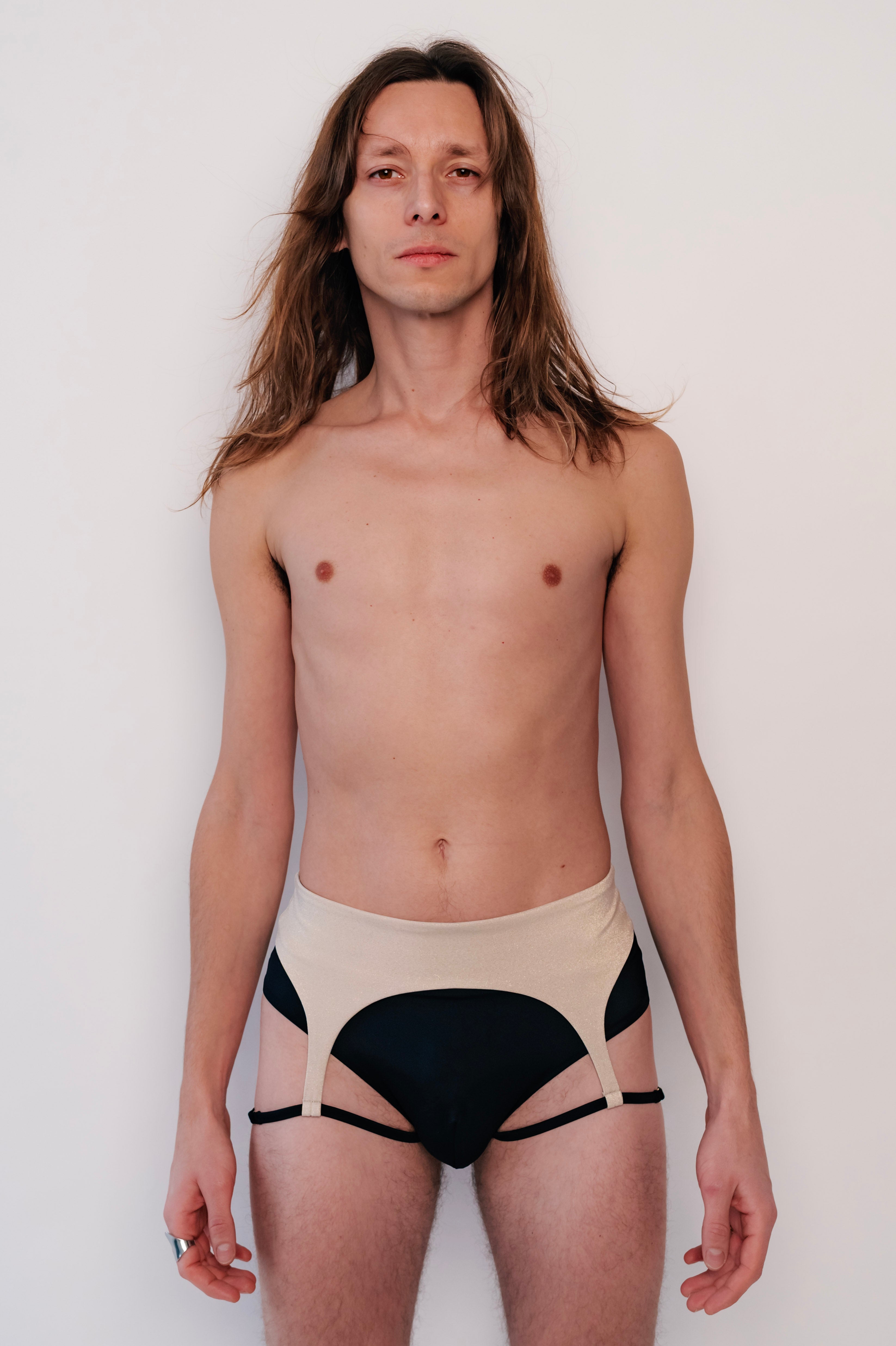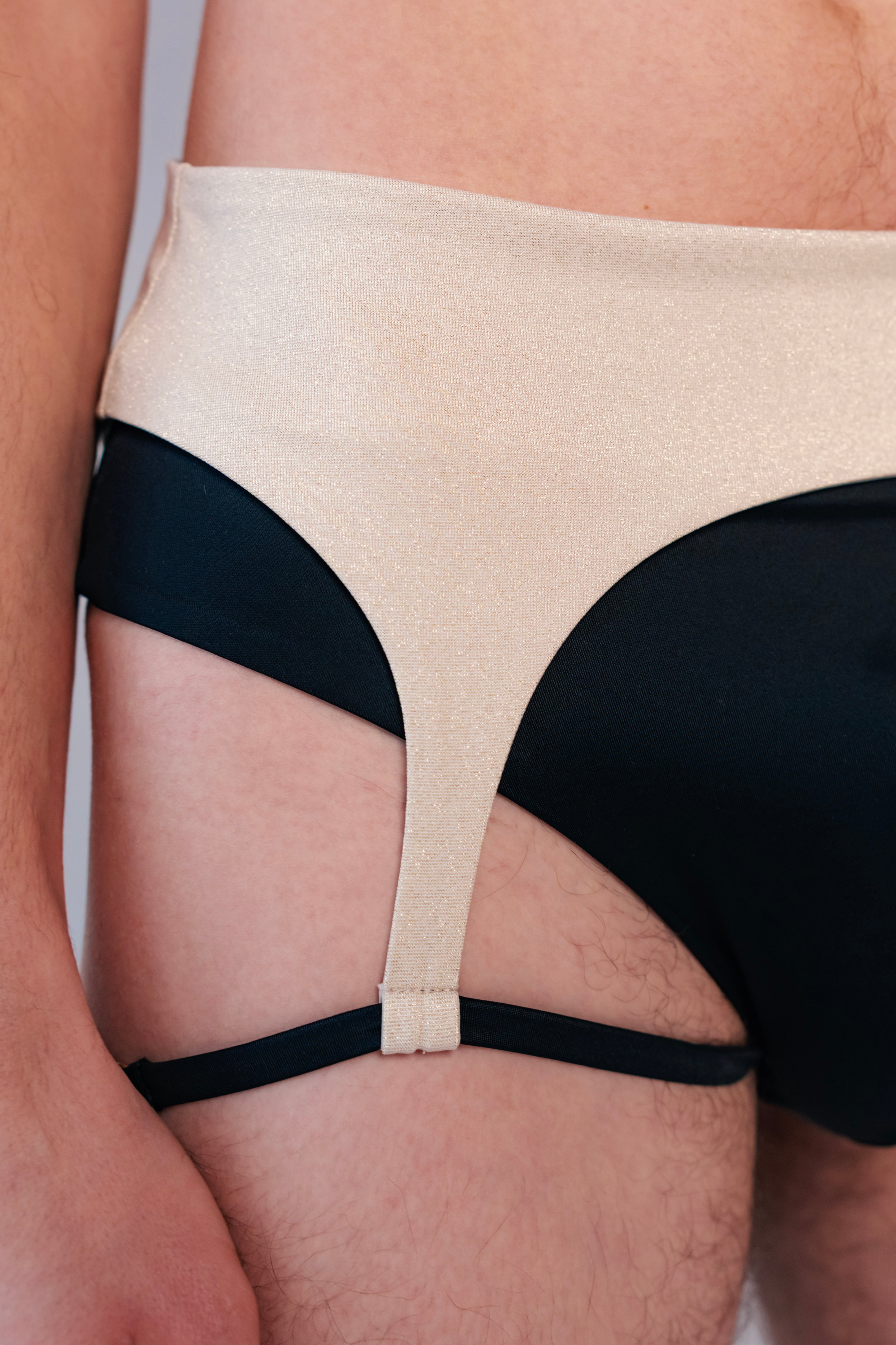 Our signature garter design that revolutionized pole fashion in 2017, now tailored for masculine lines. The golden lurex garter belt contrasts boldly against sleek black shorts, while adjustable straps frame powerful thighs. The contoured front provides comfortable support where you need it. Metal hardware adds industrial edge to this iconic design.